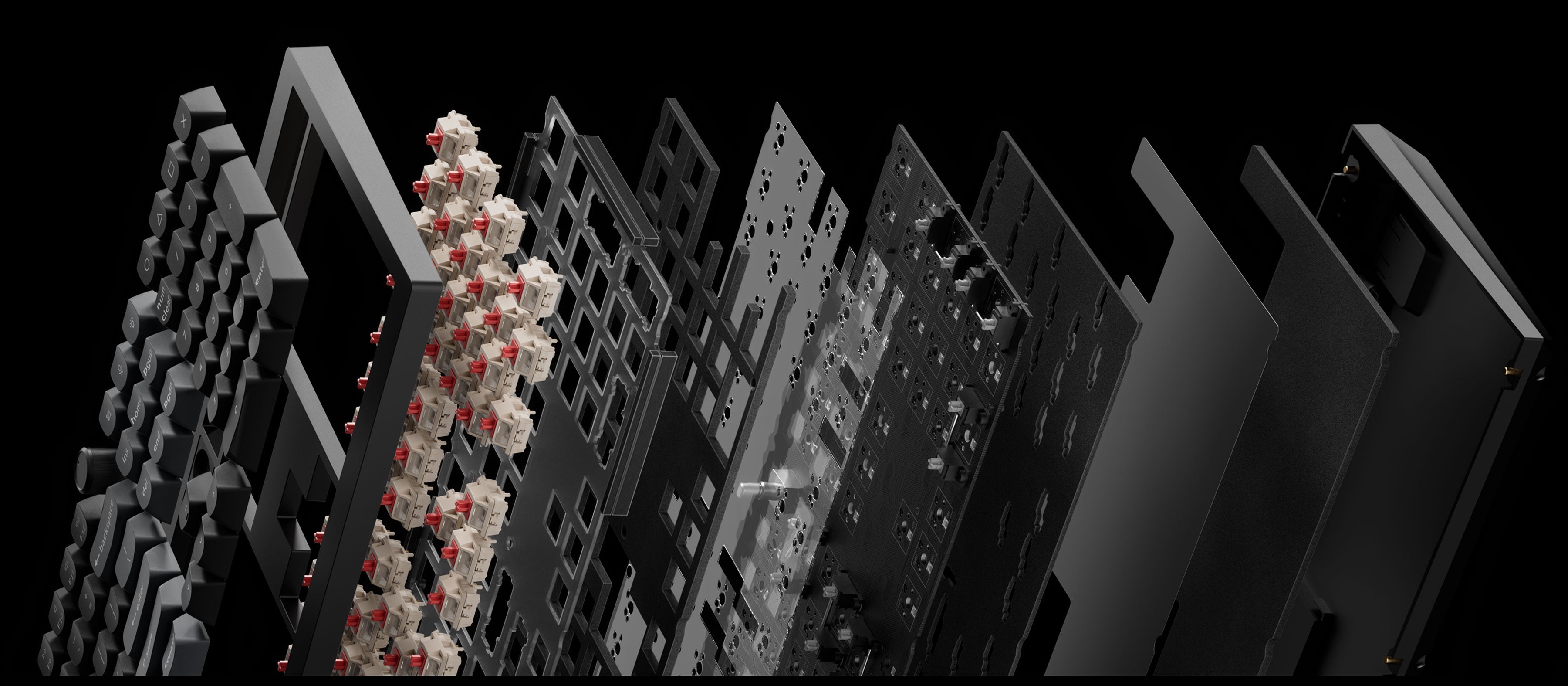 - The keyboard PCB, the case, and the PC plate.